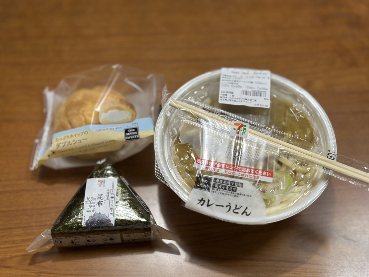 帰りは唐木田のセブンイレブンで夕食にカレーうどんとおにぎり さらにシュークリームを買って帰宅